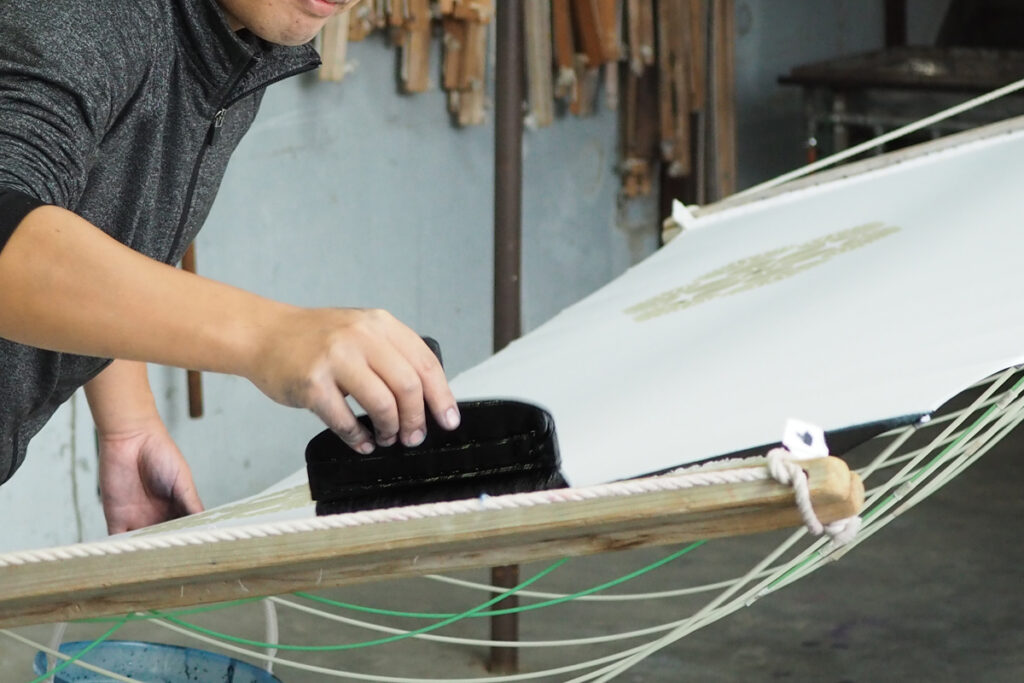 京都のまちを歩いているとお店の前にのれんがかかっているのをよく見かけます。高級な飲食店などは、お店の顔となるのれんに特にこだわりがあり、現在はネットオーダープリントのれんが簡単に安く手に入る中、職人の手染めによるこだわりの品をお求めになられます。そんなニーズに長年応えてまいりました。ほかにも幕や幟など、様々な商品の一点ものオーダーメイド染を行っています。