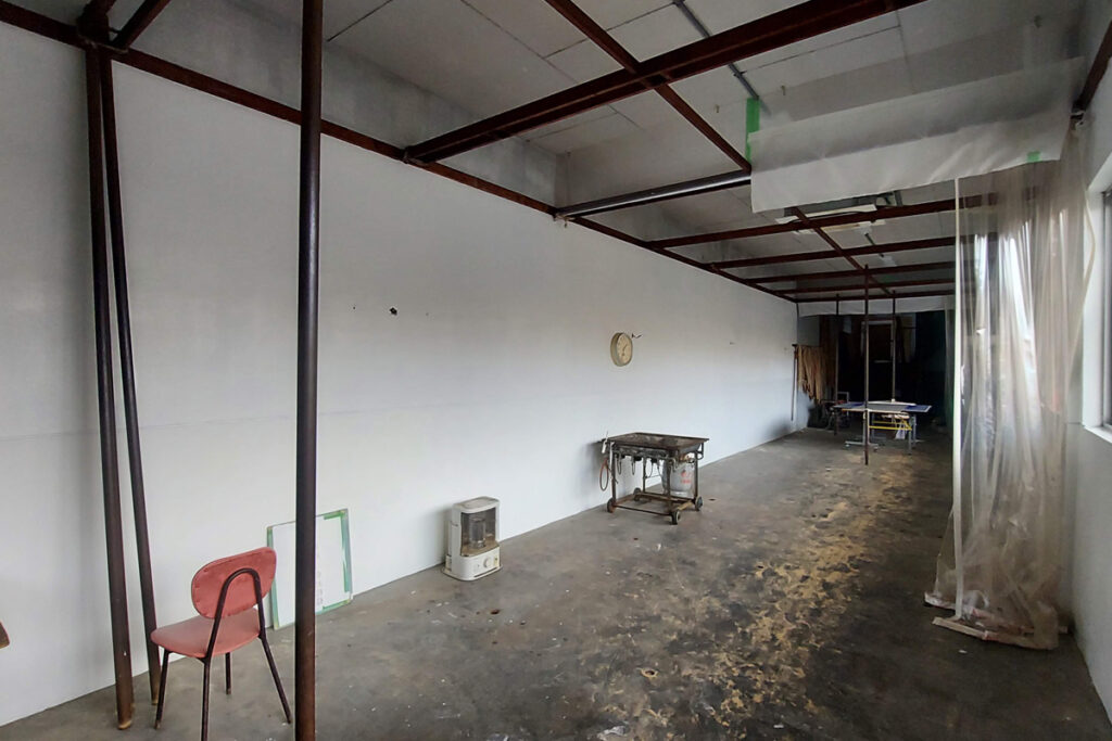 広い染物工場を展覧会会場としても使えるよう、白で壁を塗装し、ライトと大型プロジェクターを導入しました。展覧会会場として週末や連休中にお使いいただけます。
